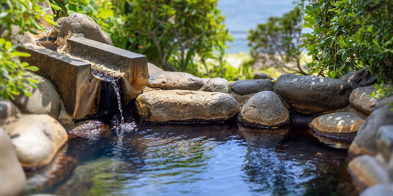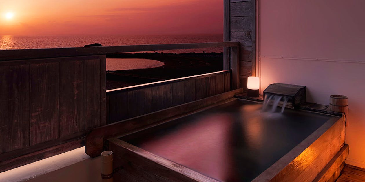 客室露天風呂のお部屋は「瑠璃(岩風呂)」、「伽羅(檜風呂)」、「潮騒(伊豆石風呂)」の3種類あり、心地よい潮風と波音を感じながら北川温泉のお湯を贅沢に愉しめます。