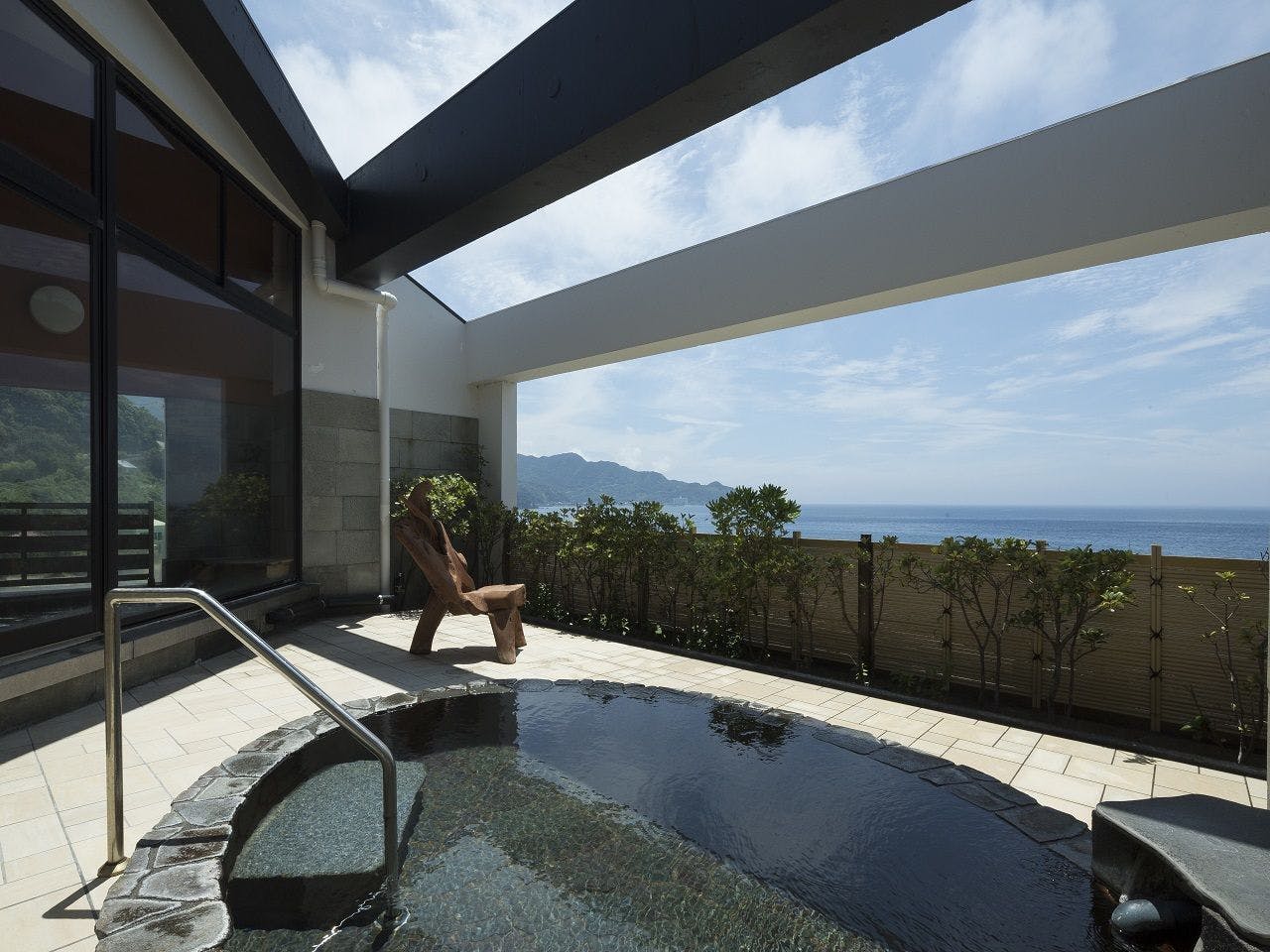 客室露天風呂のお部屋は「露天風呂付特別室」と「露天風呂付客室」の2種類あり、どちらもオーシャンフロントとなっているため、露天風呂につかりながら東伊豆の雄大な海の景色を愉しむことが出来ます。