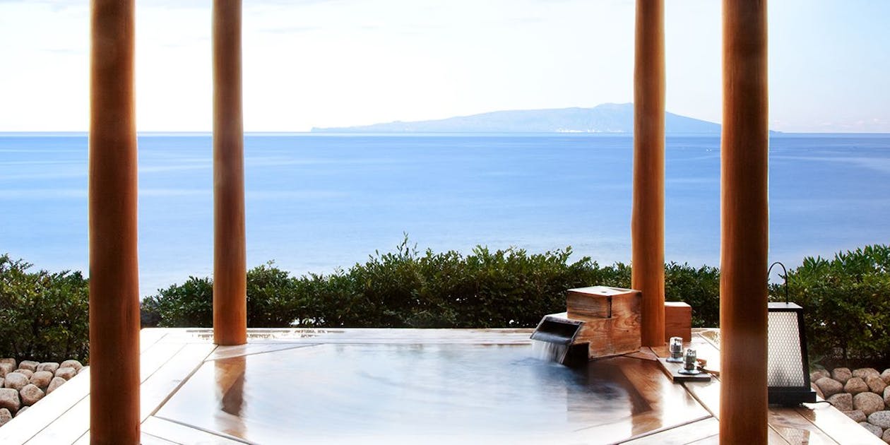 東伊豆の壮大な海を一望できる露天風呂や無料で利用できる絶景貸切露天風呂が人気の湯宿「片瀬館ひいな」。